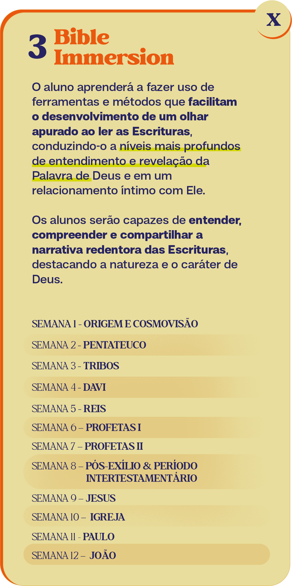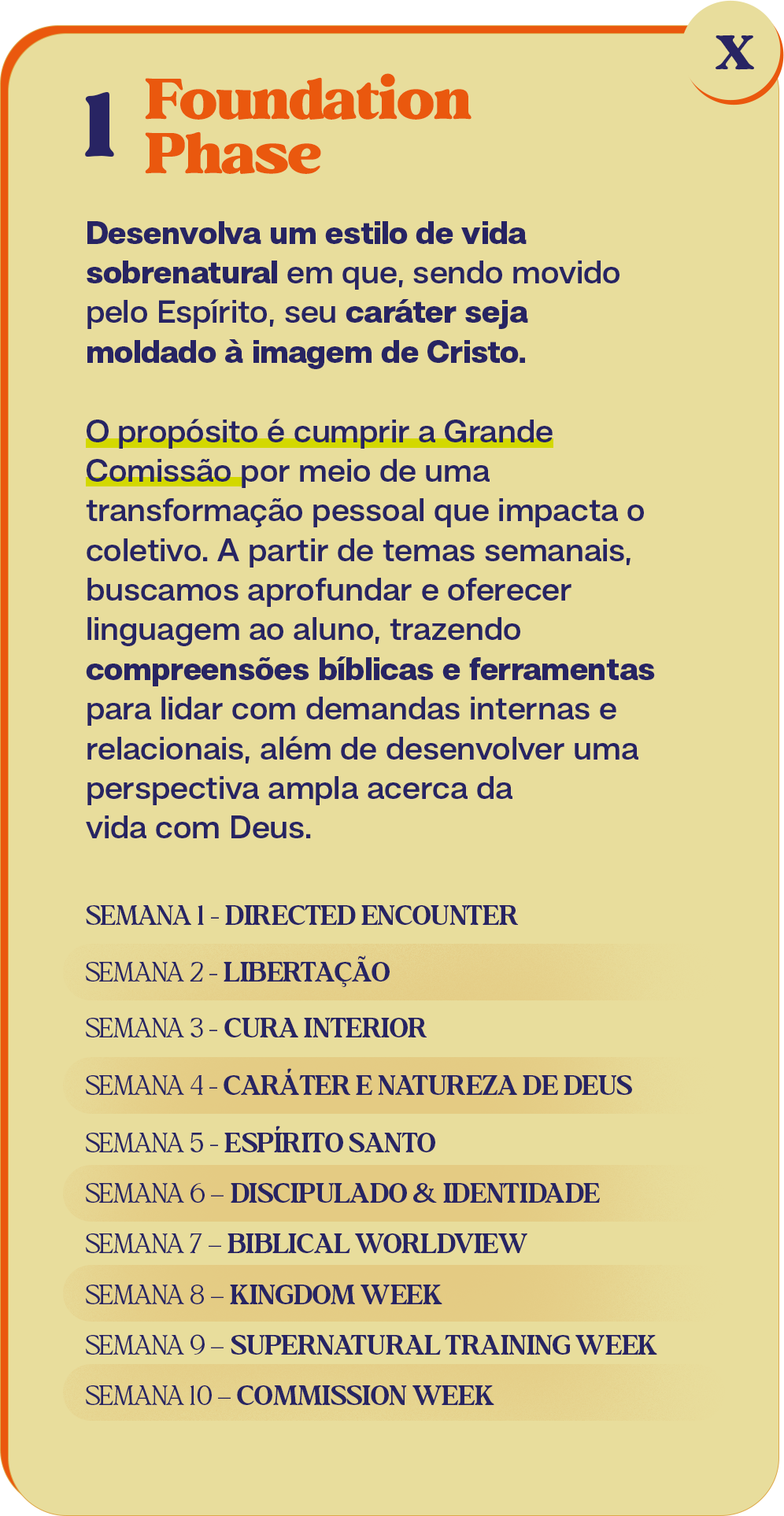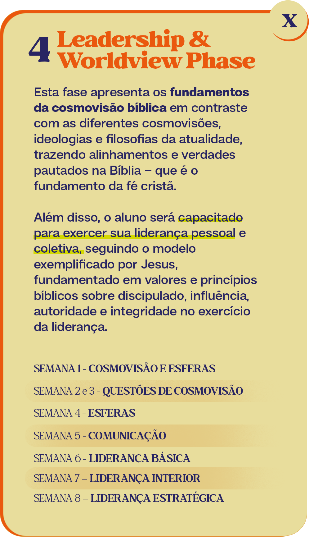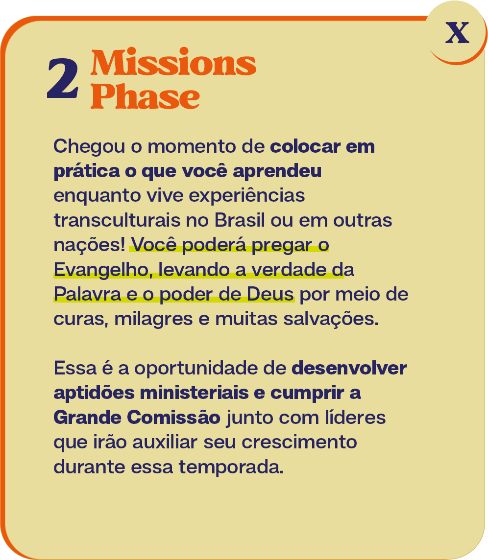 Esta fase será concluída em um período de dois meses de preparação, em que você será capacitado para impactar a esfera à qual o Senhor o chamou e aprenderá sobre cosmovisão bíblica e liderança sobrenatural.