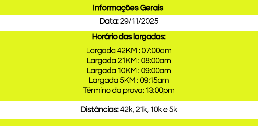 Os resultados oficiais serão informados em até 2hs após o encerramento da corrida. Qualquer dúvida sobre o resultado final deverá ser feita via e-mail ([email protected]).