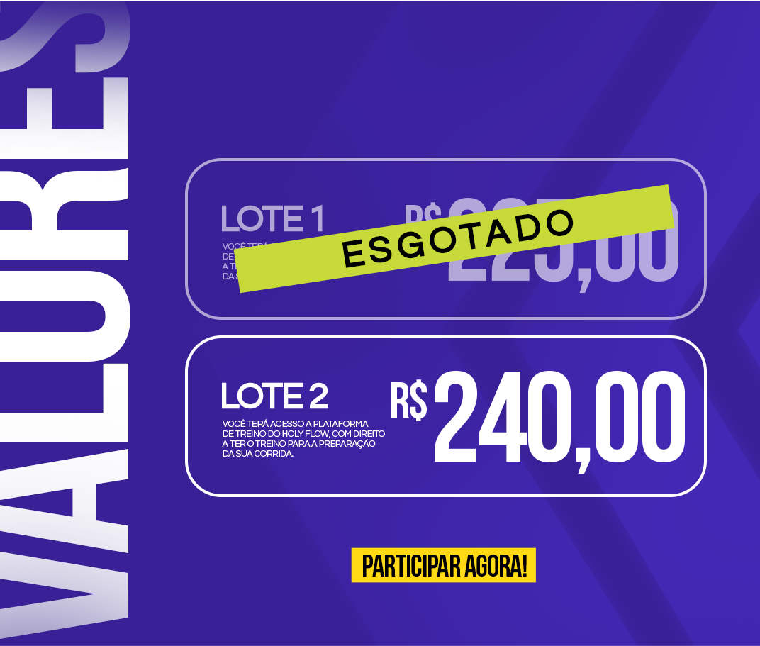 *As condições climáticas, de qualquer natureza, não interferem na realização da prova. Fica reservado ao Holy Flow/Dunamis, organizadoras do evento, a decisão sobre qualquer eventualidade relacionada ao tema.